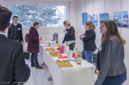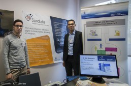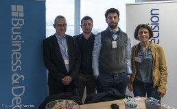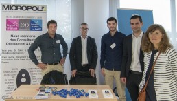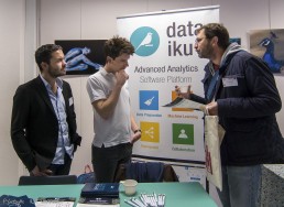 Suivent des photos des partenaires de la journée ; obtenir des pauses naturelles, en faisant ressortir les logos des entreprises, mais surtout après leur avoir fait faire le ménage de leur table (sacs en plastique, journaux du matin, tasses de café – oups ! il en reste une. Bref, du sérieux, du professionnel ! J’ai même demandé à quelqu’un de chez Micropol de se placer juste devant le logo de son voisin Business&Decision. Une photo par stand et un stand par photo.