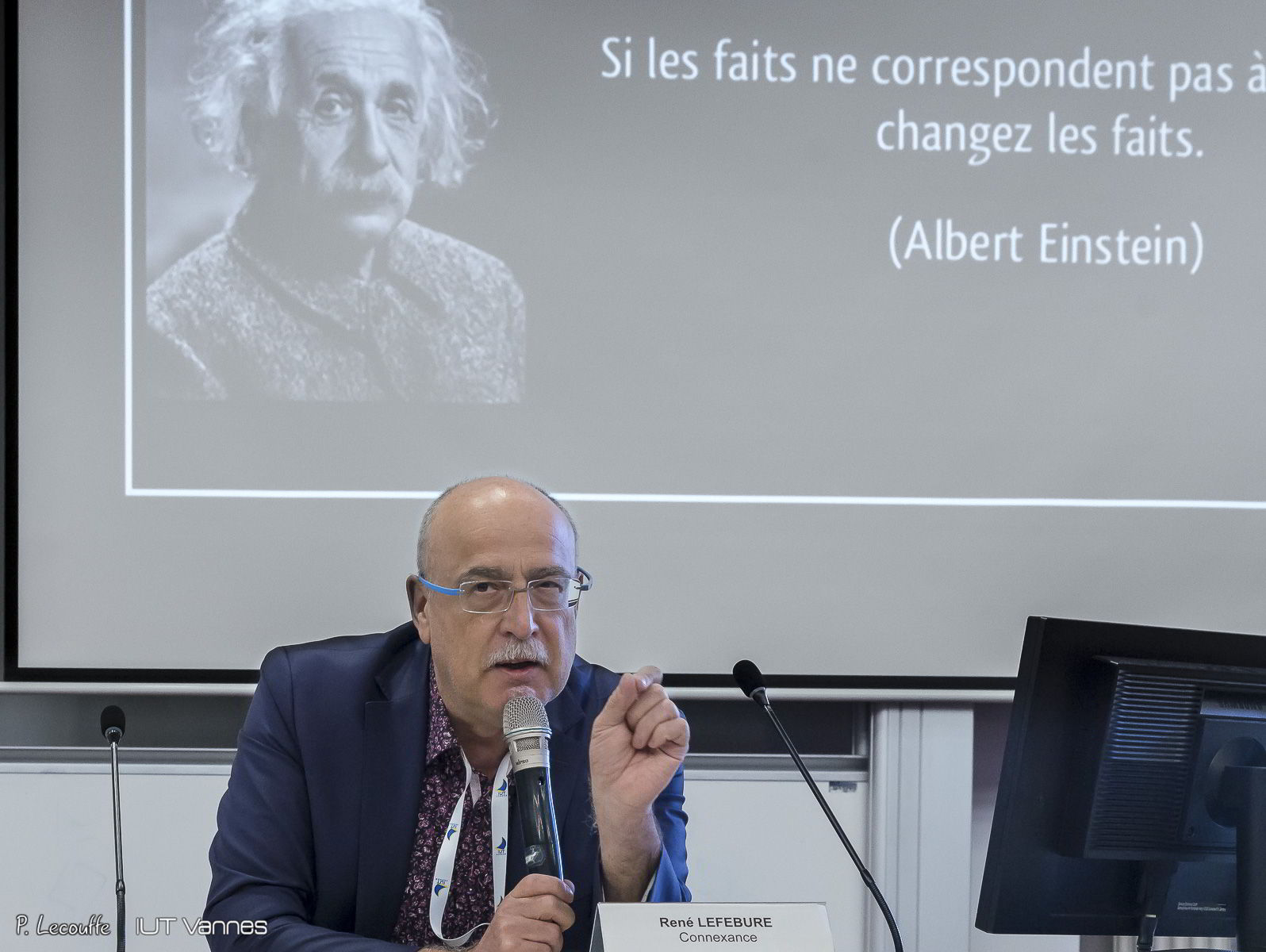 Note : Certaines photos peuvent froisser les yeux des portraitistes avec le sujet au centre ou du mauvais côté par rapport à la direction du regard, mais au développement je me suis donné la contrainte de faire ressortir en priorité les informations sur les marques, les noms des intervenants, l’indication du lieu (université de Bretagne)… Un gros regret, avoir loupé (coupé) la légende légendaire d’Einstein coiffant la tête de M. Lefebure : « Si les faits ne correspondent pas à la théorie, changez les faits. » – Mais comme en réalité, cette citation n’aurait pas de source avérée, ce n’est pas très grave.