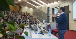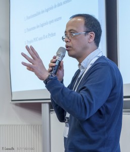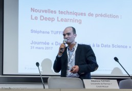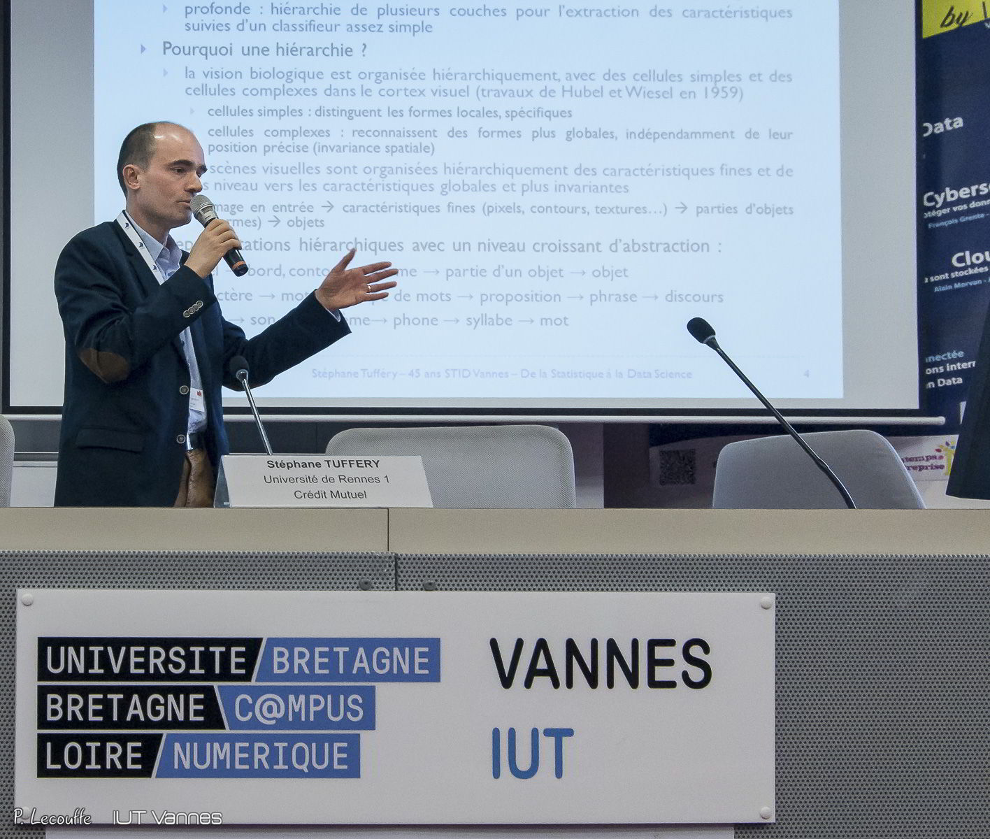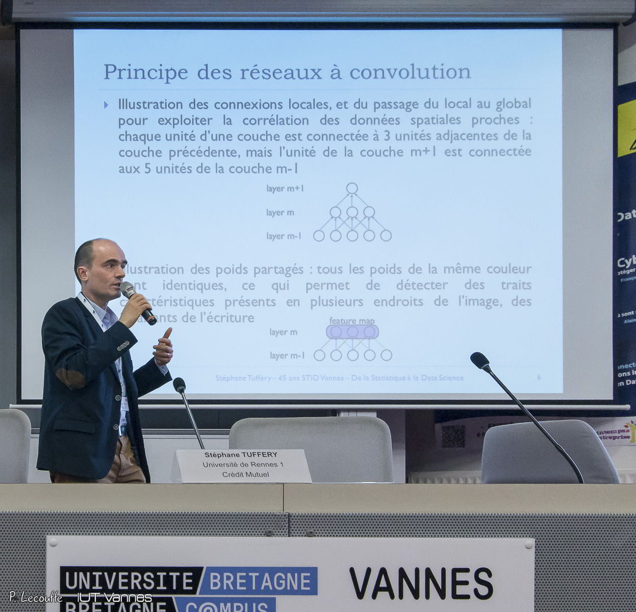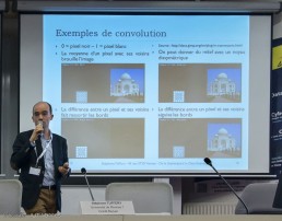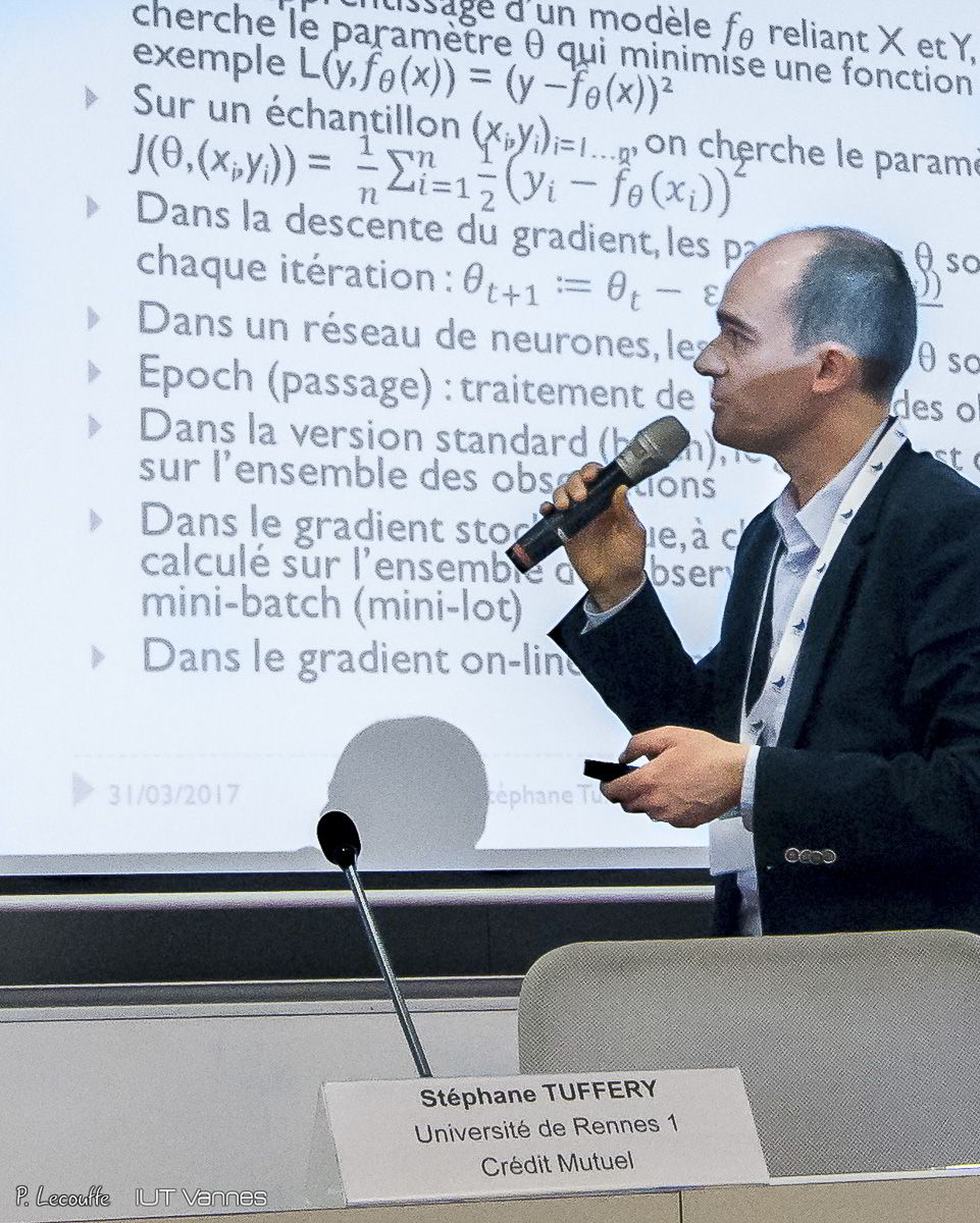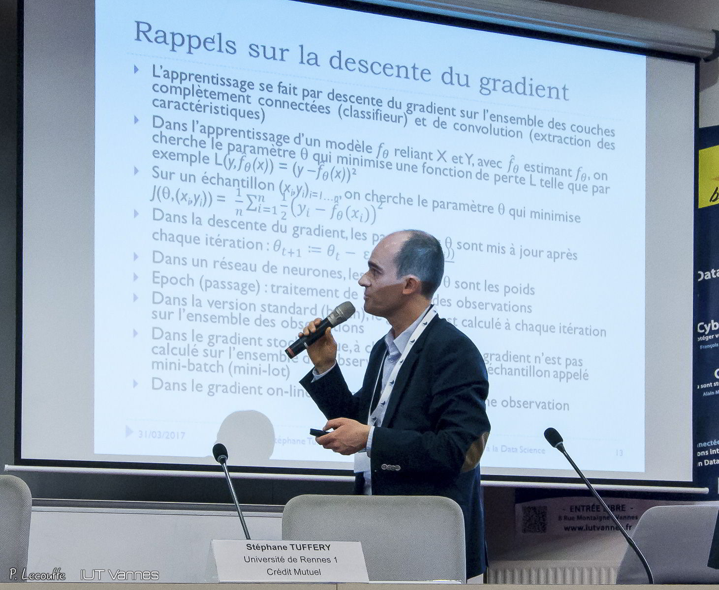 Puis M. Stéphane Tuffery sur le Deep Learning. J’ai compris des tas de choses sur les algorithmes de traitement des images que j’utilise au quotidien avec Lightroom. Mais j’ai vite été dépassé par ses « Rappels sur la descente du gradient ». Je me suis vengé en le cadrant juste devant une formule mathématique absconse pour le commun des mortels. Je l’avoue, ce cadrage était prémédité, j’ai attendu qu’il passe juste devant la formule.