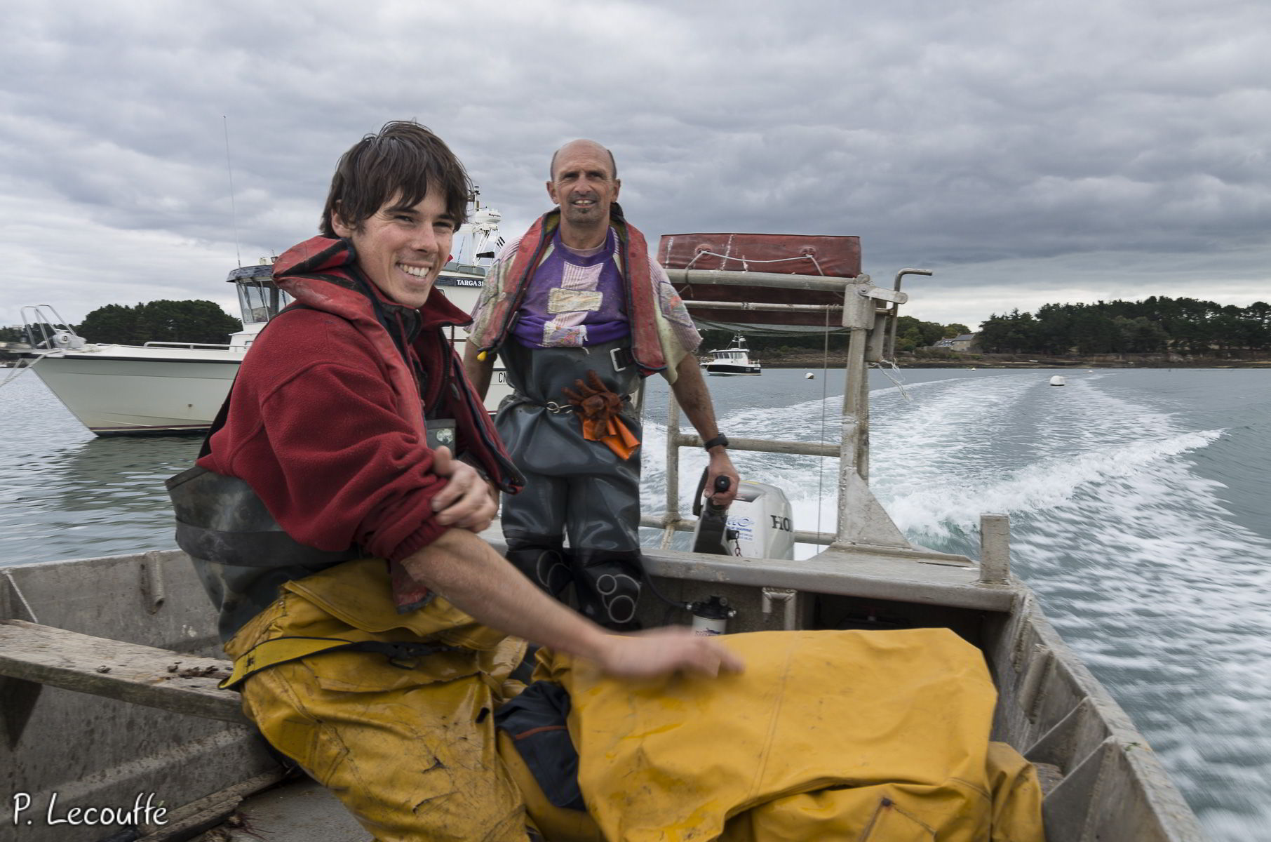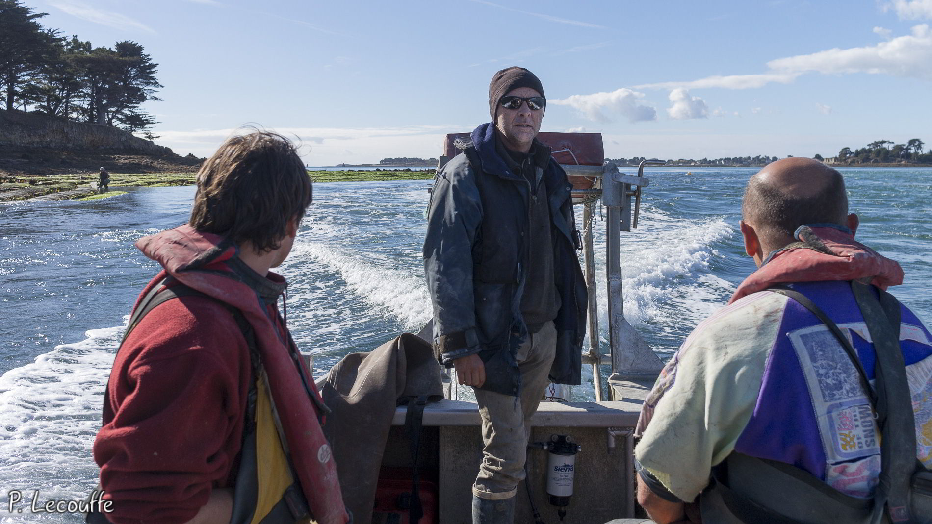 Effectivement le travail ne peut se faire qu’au rythme des marées. Cela commence (et finit) par un bon quart d’heure de navigation pour rejoindre le parc à la sortie du golfe du Morbihan, dans une zone où les courants sont idéaux et où les huîtres se plaisent.