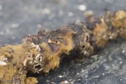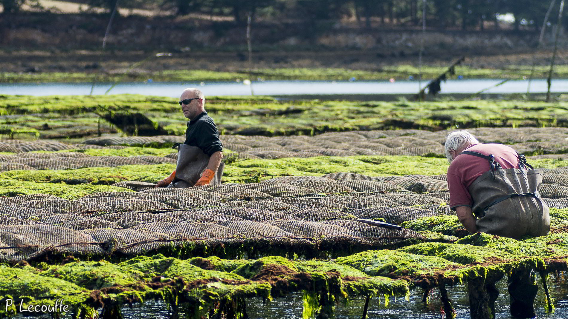 Des algues se forment à la surface des poches d’huîtres, ce qui les empêche de bien se nourrir et prendre la lumière. Il s’agit aujourd’hui, comme régulièrement, de frapper les poches pour que les huîtres se détachent les unes des autres puis de les retourner. Les algues seront alors privées de lumière et pourriront.
